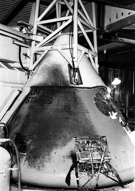 Several hours into the test a wire sparked and ignited the oxygen-rich atmosphere. The fire ran rapidly across the capsule, feeding on flammable material throughout the ship. With temperatures reaching more than a thousand degrees, the astronauts perished in seconds.