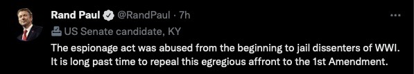 Senator Rand Paul has taken some heat for a recent tweet that called for the repeal of the Espionage Act, passed by Congress in 1917 as America entered World War I. Since this law is the one that will likely be used against former president Donald Trump, in the latest attempt by the government to pin something on him, Paul’s detractors have taken to painting him with the same “Russian agent” brush they use for anyone who says anything in defense of Trump.