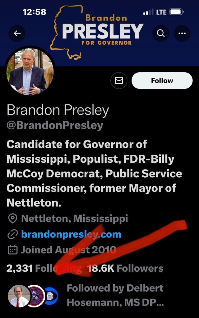 Yet, even more troubling, when you look at Brandon Presley’s Twitter page, you find his number one follower: